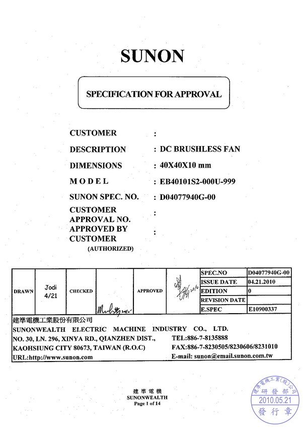 Wentylator 5V; 40x40x10mm; łożysko ślizgowe wydajność 11,8m3/h; poziom hałasu 27dBA; 5 V DC ( 3,5-6,0 V DC) I=0,205A ( 0,236 mA max) 1W(1,18W max ) Podobny KDE0504 MB40100V2-A99