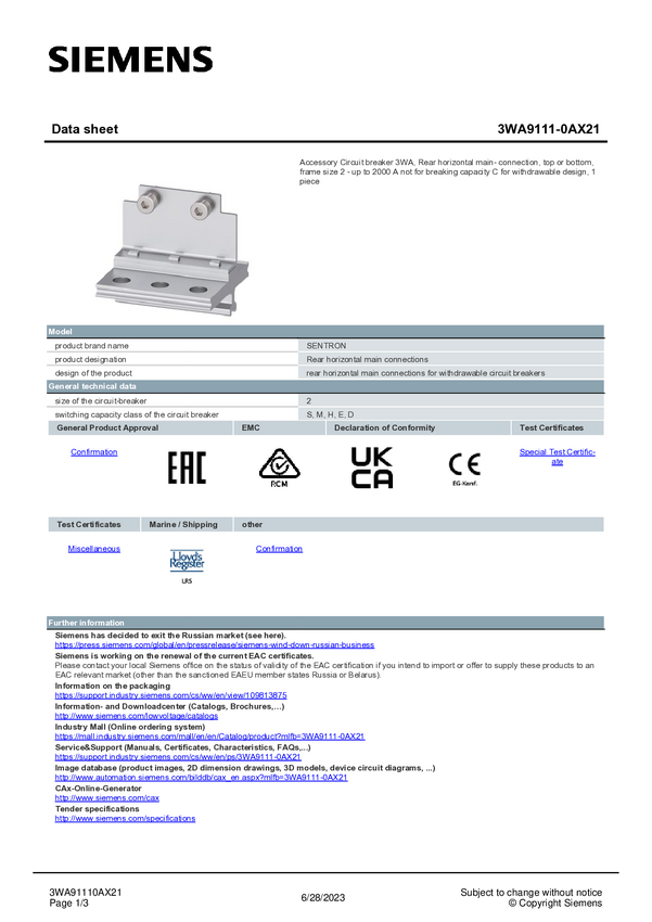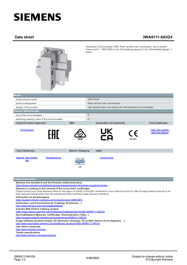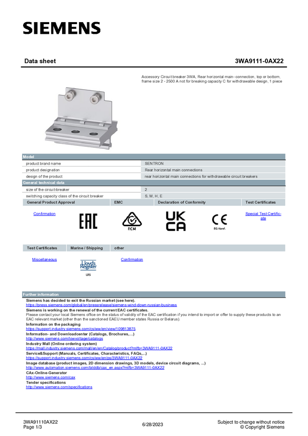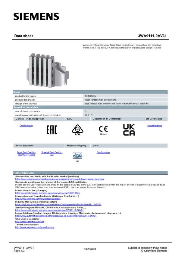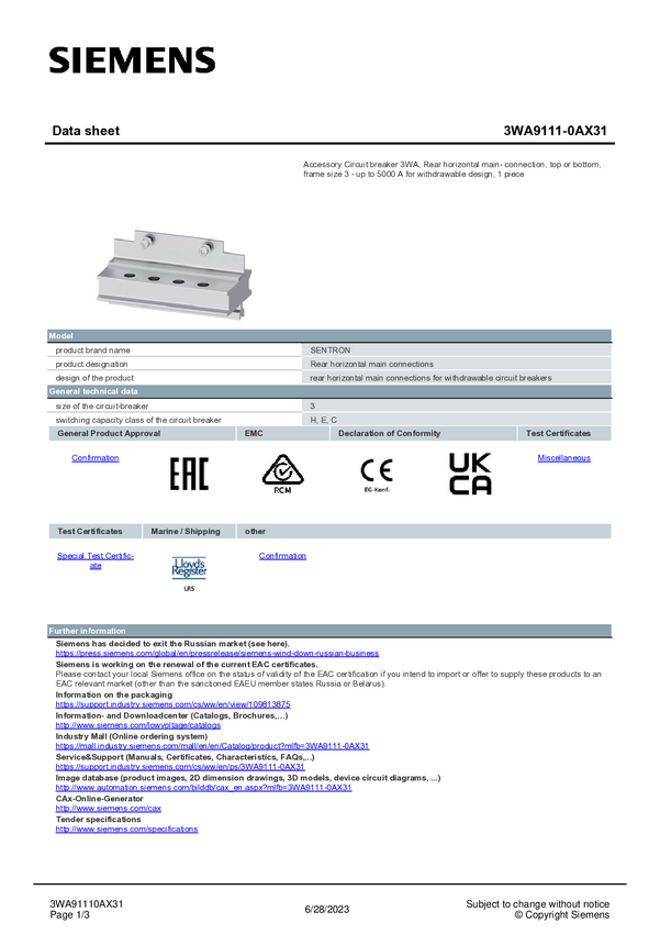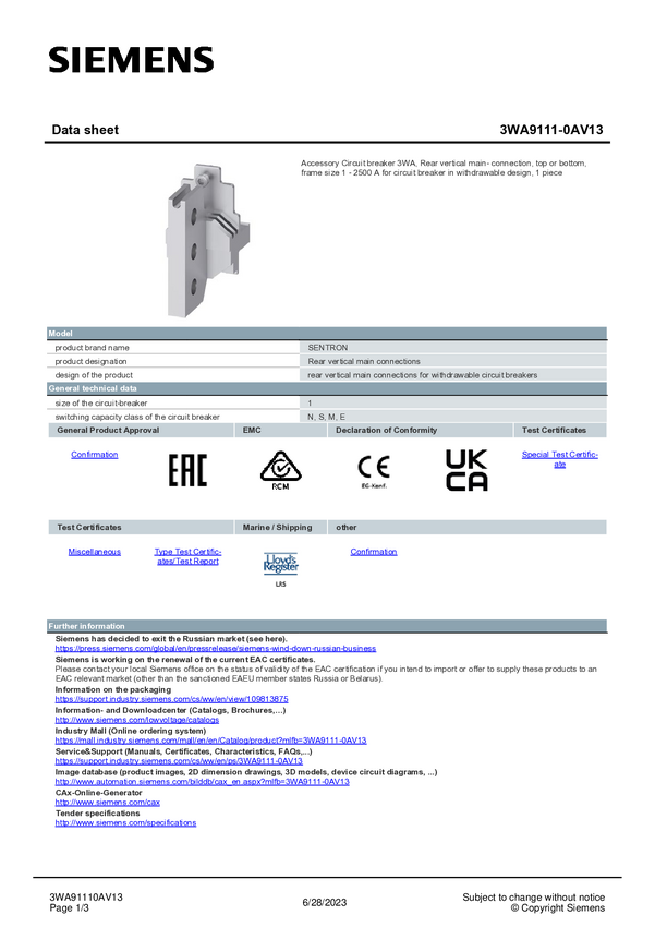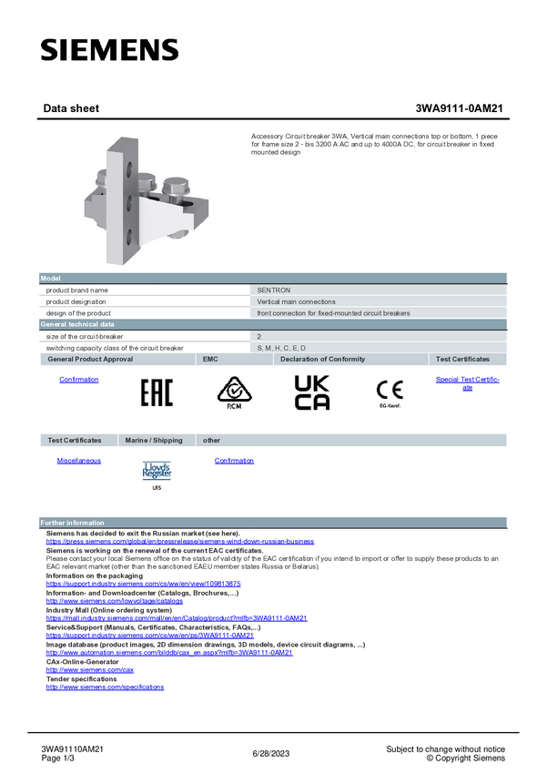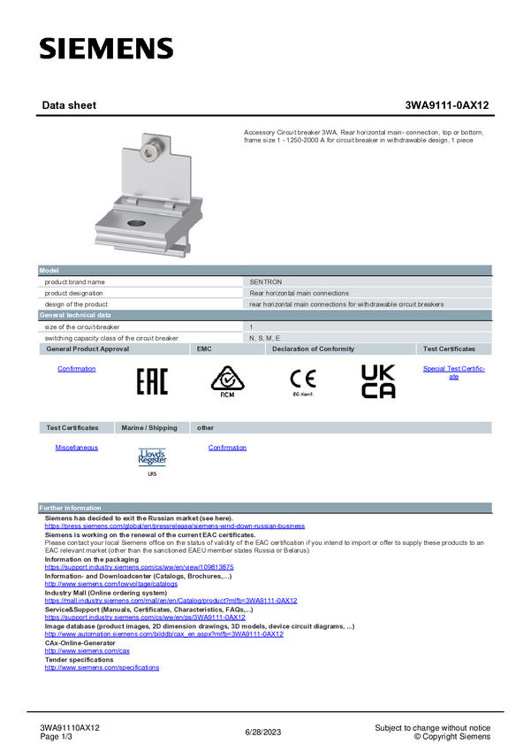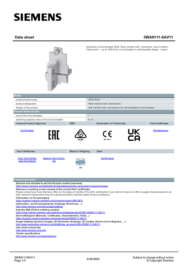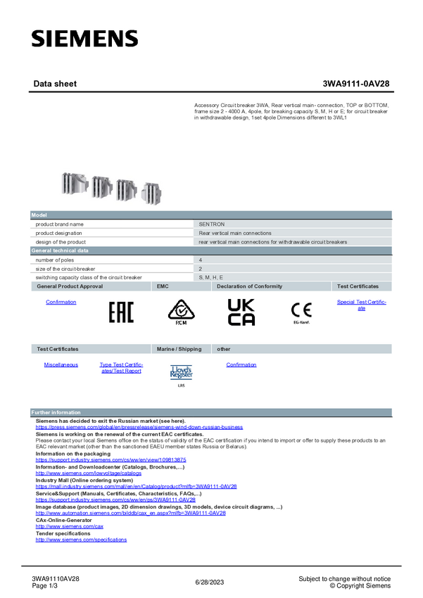 Główne połączenia Siemens 3WA9111-0AV28 1 szt.