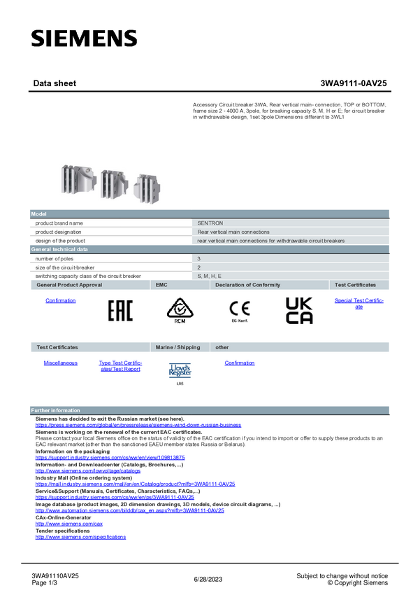 Główne połączenia Siemens 3WA9111-0AV25 1 szt.