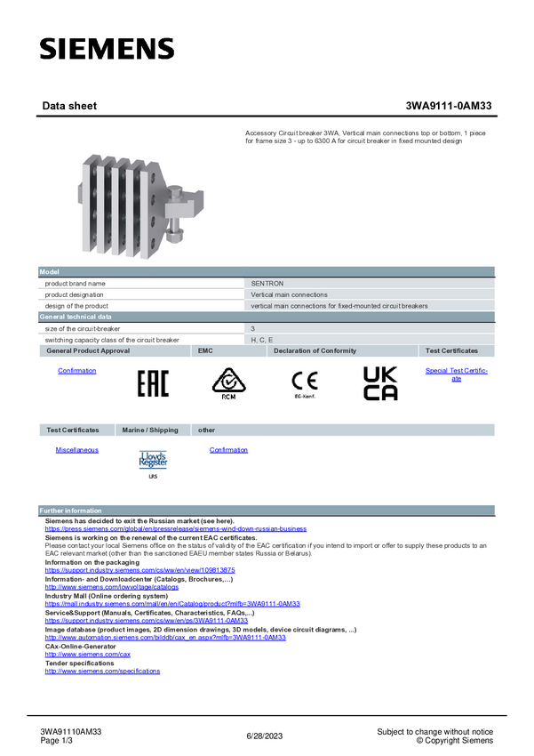 Główne połączenia Siemens 3WA9111-0AM33 1 szt.