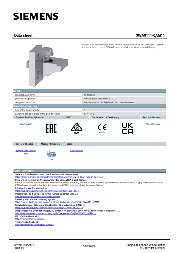 Główne połączenia Siemens 3WA9111-0AM11 1 szt.