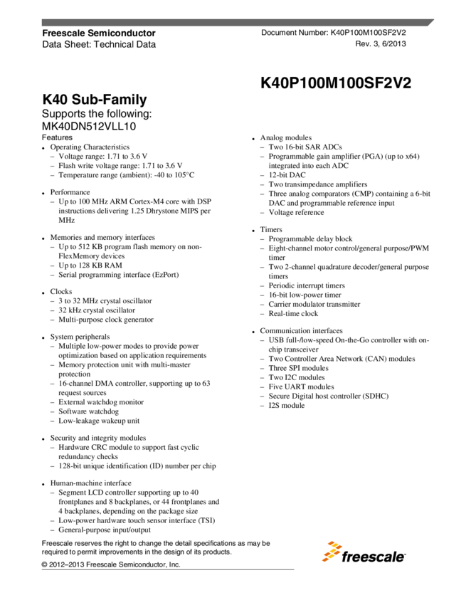 Kinetis K40: 72MHz Cortex-M4 up to 288KB Flash 100/121pin