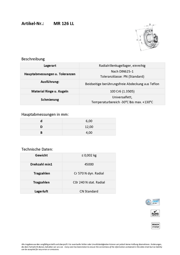Łozysko kulkowe Reely MR 126 LL, Szerokość: 4 mm, 1 szt.