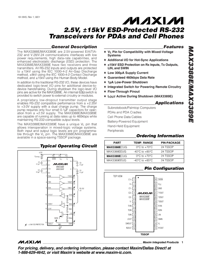 MAX3388E, MAX3389E 2.5V, ±15kV ESD-Protected RS-232 Transceivers for PDAs and Cell Phones