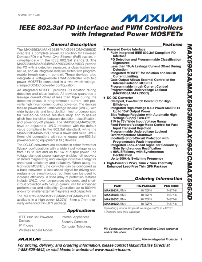 MAX5953, MAX5953A, MAX5953B, MAX5953C, MAX5953D IEEE 802.3af PD Interface and PWM Controllers with Integrated Power MOSFETs