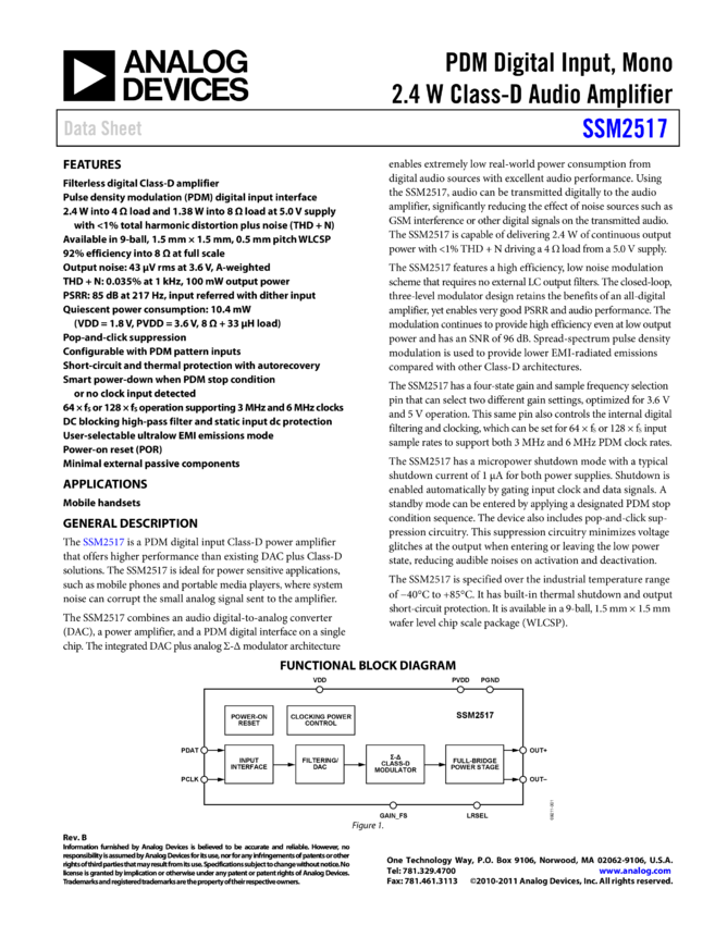 SSM2517: Digital PDM-Input Mono 2.5W Class-D Audio Amplifier
