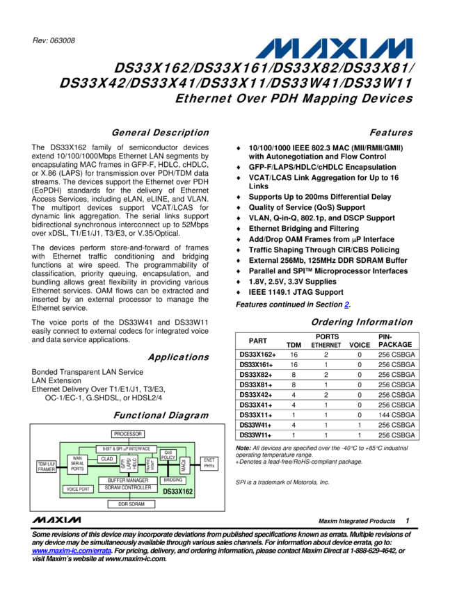 DS33W11, DS33W41, DS33X11, DS33X161, DS33X162, DS33X41, DS33X42, DS33X81, DS33X82 Ethernet Over PDH Mapping Devices