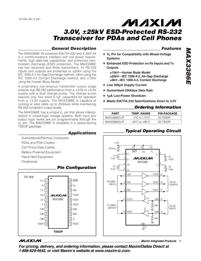 MAX3386E 3.0V, ±15kV ESD-Protected RS-232 Transceivers for PDAs and Cell Phones