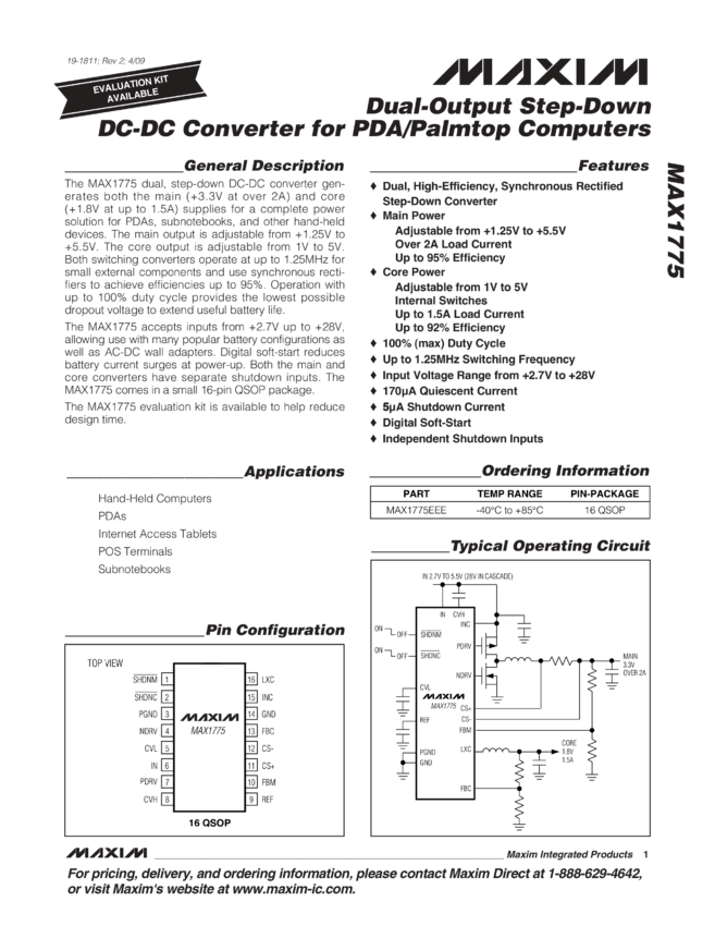 MAX1775 Dual-Output Step-Down DC-DC Converter for PDA/Palmtop Computers