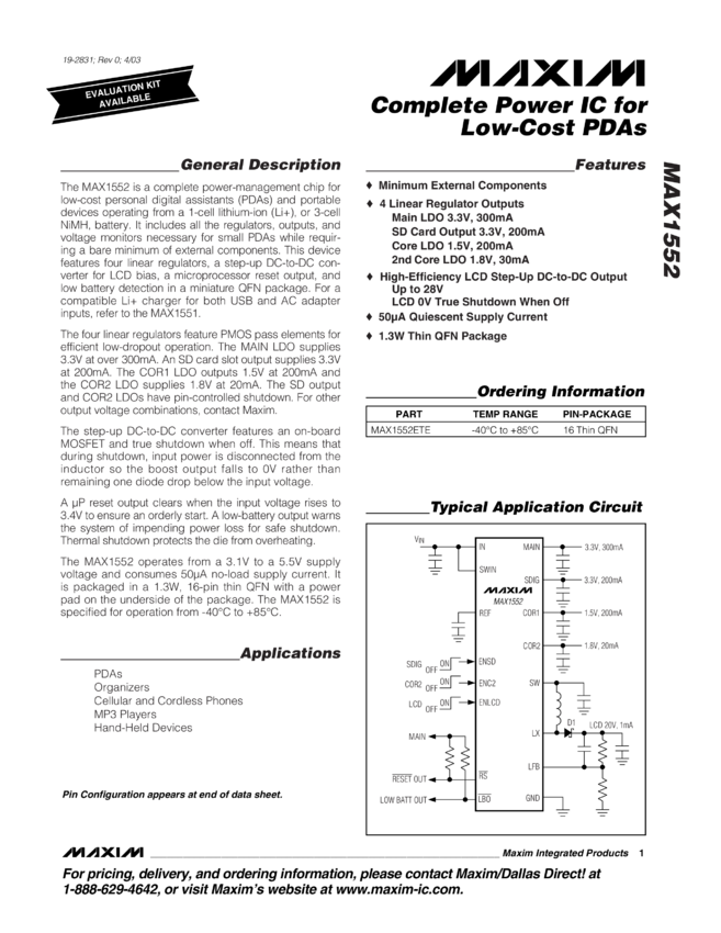 MAX1552 Complete Power IC for Low-Cost PDAs