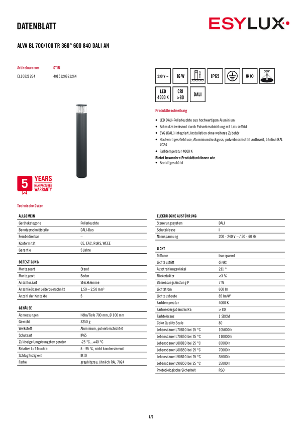 Słupek świetlny LED ESYLUX EL10821264 EL10821264 600 lm IP65