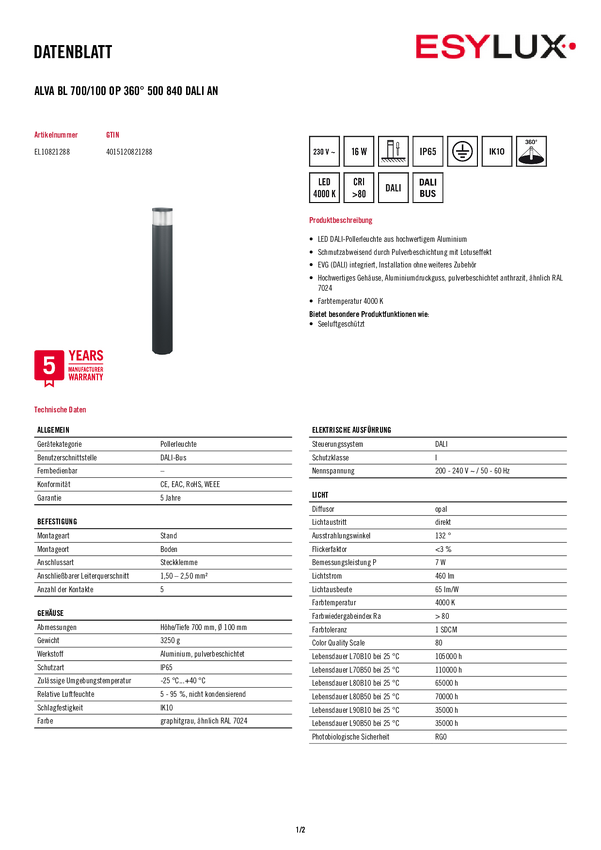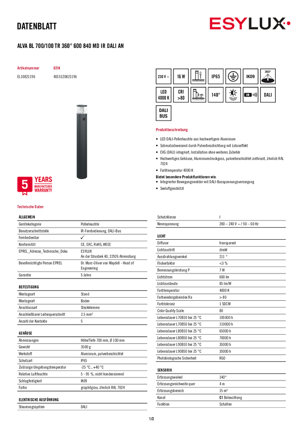 Słupek świetlny LED ESYLUX EL10821240 EL10821240 460 lm IP65