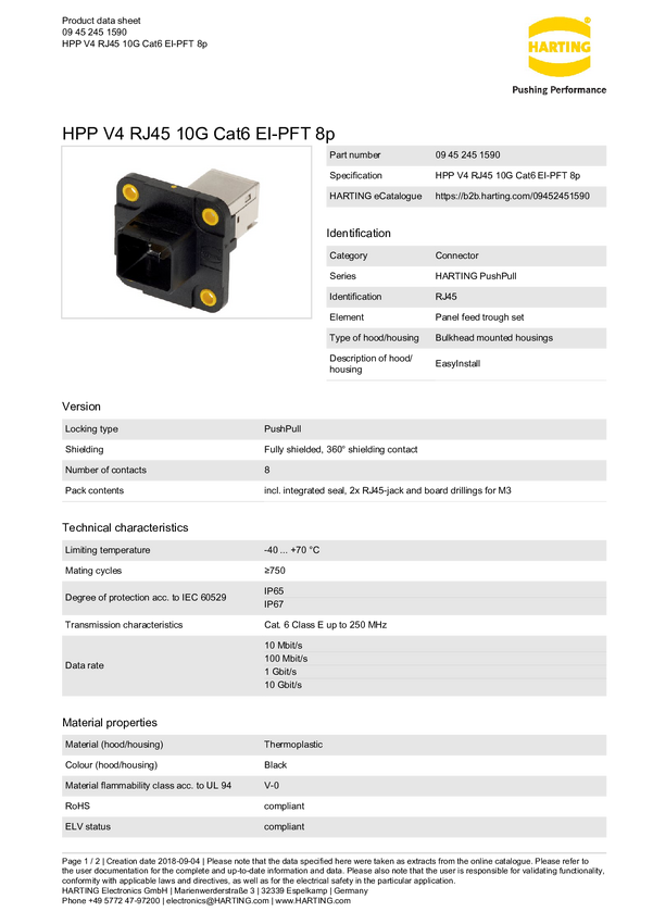 Zestaw przepustu ściennego Harting 09 45 245 1590, 1 szt.