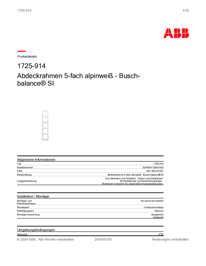 Busch-Jaeger 5 x Ramka Busch-balance SI śnieżnobiały 1725-914 1 szt.