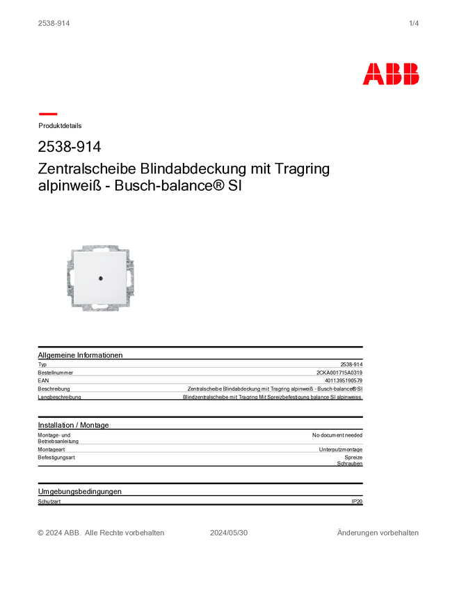 Busch-Jaeger Zaślepka Osłona Busch-balance SI śnieżnobiały 2538-914 1 szt.