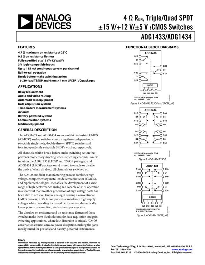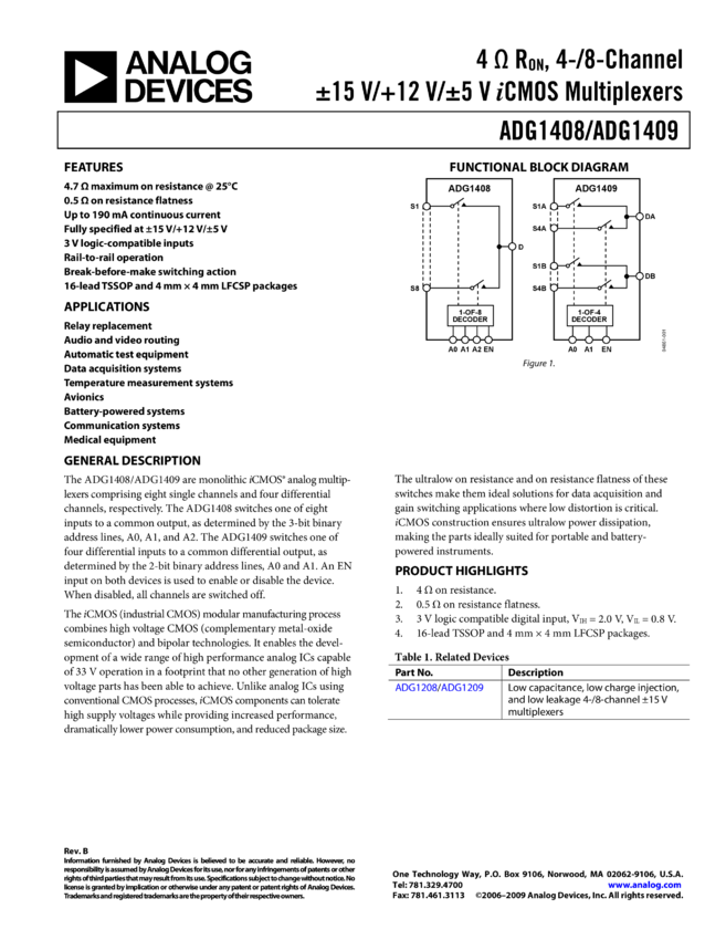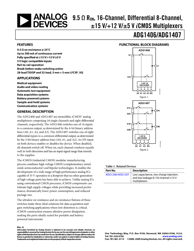 ADG1409: 4 Ω Ron, 4 - /8 - Channel ±15 V/+12 V/±5 V CMOS Multiplexer
