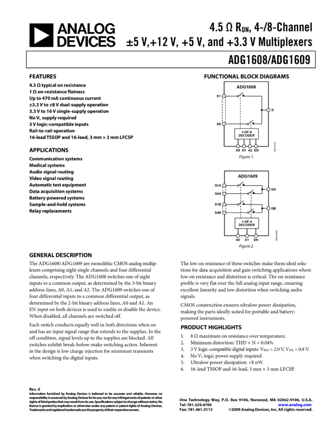 ADG1609: 4.5 Ω RON, 4-Channel ±5 V,+12 V, +5 V, and +3.3 V Multiplexer