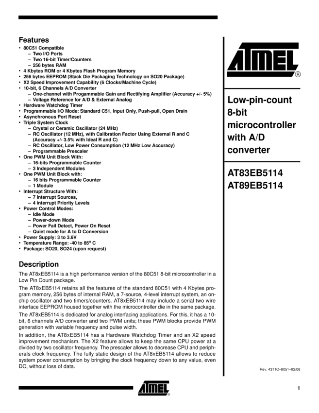 Low-Pin-Count 8-Bit Microcontroller, A/D Converter, ROM
