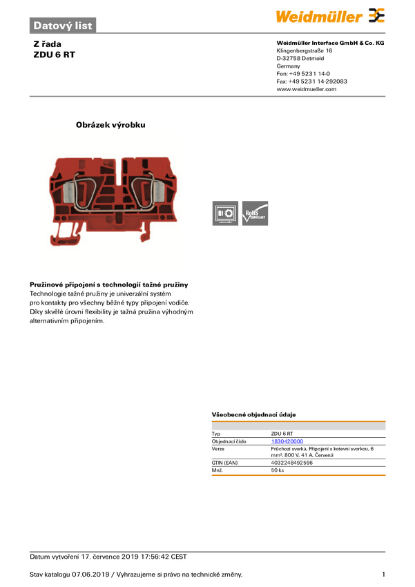 Złączka szynowa przelotowa Weidmüller 1830420000 sprężynowe 50 szt.