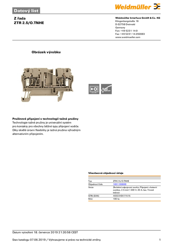 Zacisk rzędowy pomiarowy Weidmüller 1831130000 sprężynowe 100 szt.