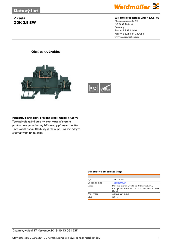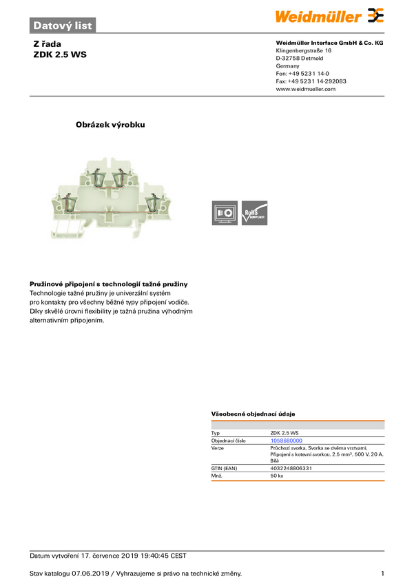 Złączka szynowa przelotowa Weidmüller 1748790000 sprężynowe 50 szt.