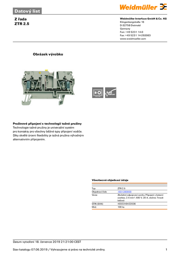 Zacisk rzędowy pomiarowy Weidmüller 1831280000 sprężynowe 100 szt.