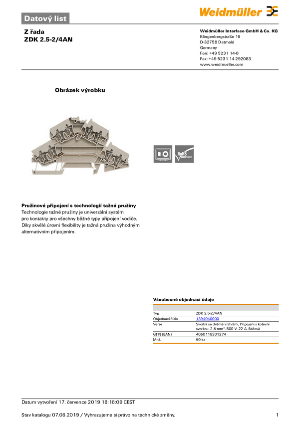 Złączka szynowa przelotowa Weidmüller 1394040000 sprężynowe 50 szt.