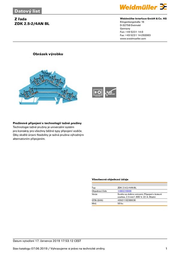 Złączka szynowa przelotowa Weidmüller 1480270000 sprężynowe 50 szt.