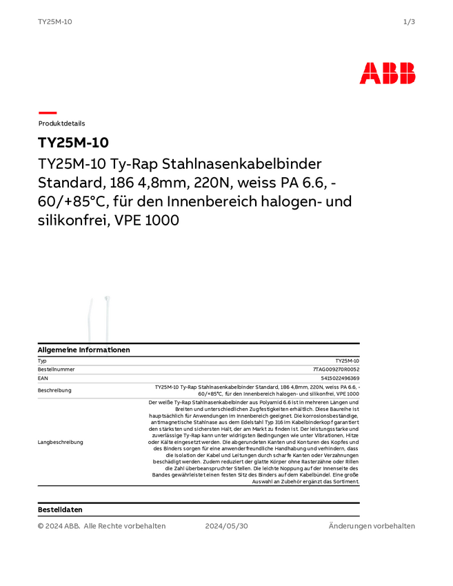 ABB 7TAG009270R0052 TY25M-10 Opaska kablowa 186 mm 4.7 mm biały 1 szt.