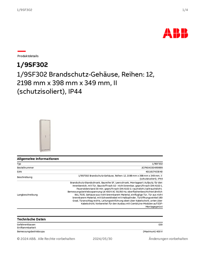 Przeciwpożarowa obudowa stojąca Striebel & John 3/8SF302 2CPX043294R9999, 898 mm x 2048 mm x 349 mm, 1 szt.