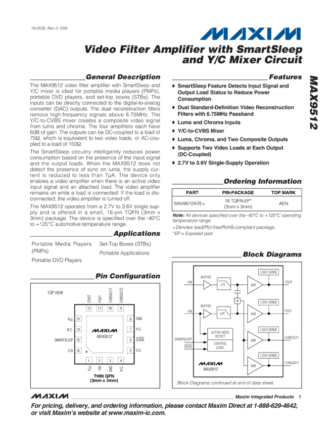MAX9512 Video Filter Amplifier with SmartSleep and Y-C Mixer Circuit
