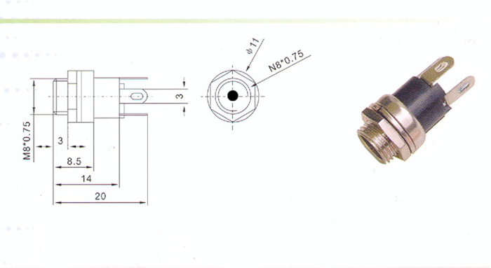 Gniazdo DC, , męskie, kołek , otwór DØ5.6 mm, , do montażu w płycie DØ8.0 mm, ze stykiem rozwiernym, 0.5A, 30V DC