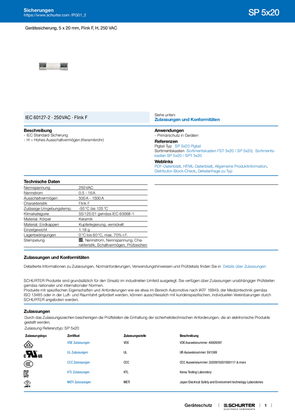 FUSE, Cartridge, Quick Acting, High Breaking Capacity, Non-resttable, SP ø5x20mm, 250Vac, 1.6A, Bulk 1000 pcs