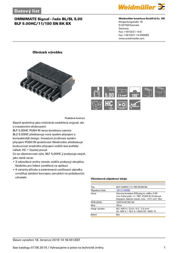 Weidmüller 1017770000 Obudowa złącza pin żeńskiego na kabel BLF 5.00HC/11/180 SN BK BX, wire-to-board, piny: 11, 18.5 A,
