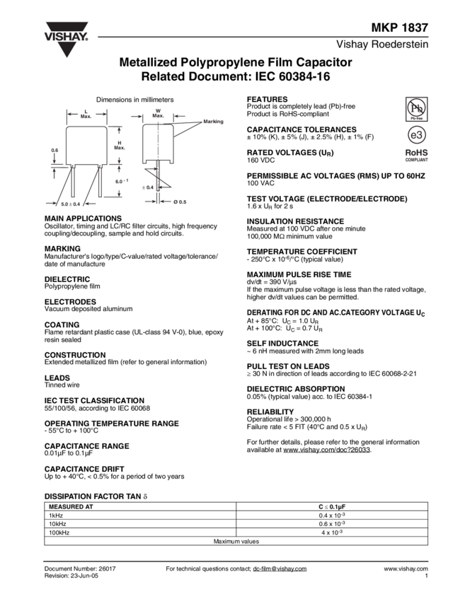 Cap Film 0.047uF 160V PP 1% (7.5 X 7.5 X 9mm) Radial 5mm 100°C Ammo Pack