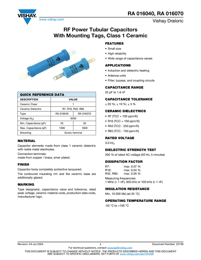 RF Power Tubular Capacitors With Mounting Tags, Class 1 Ceramic