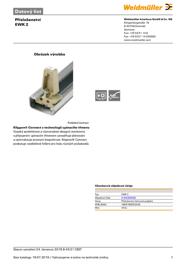 Wspornik końcowy Weidmüller EWK 2 0199360000, 50 szt.