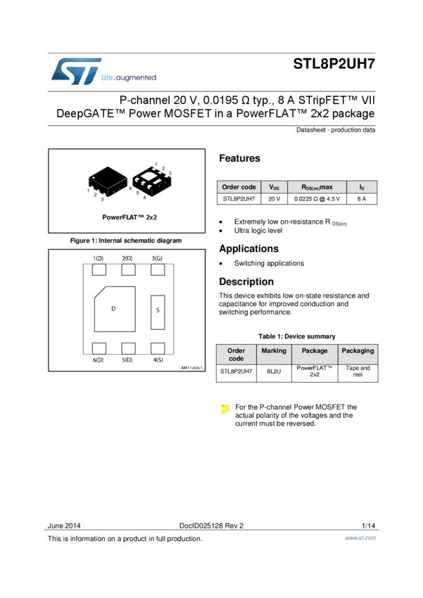P-channel 20 V, 0.0195 Ohm typ., 8 A STripFET(TM) VII DeepGATE(TM) Power MOSFET in a PowerFLAT(TM) 2x2 package