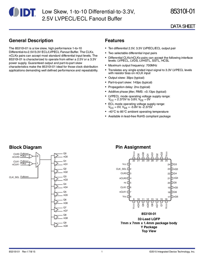 Low Skew,1-to-10 Differential-to-3.3V,2.5V LVPECL/ECL Fanout Buffer