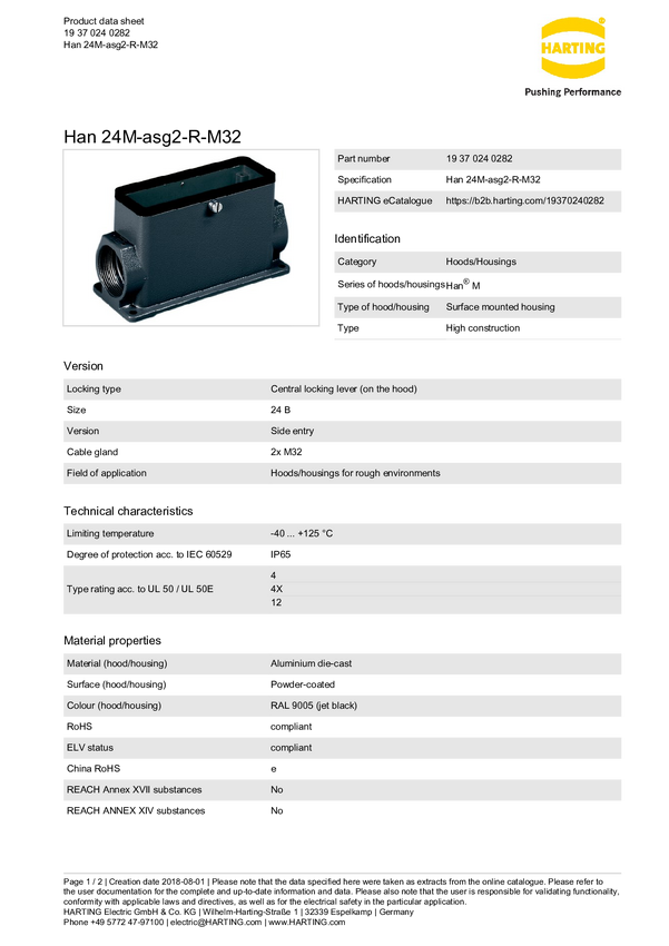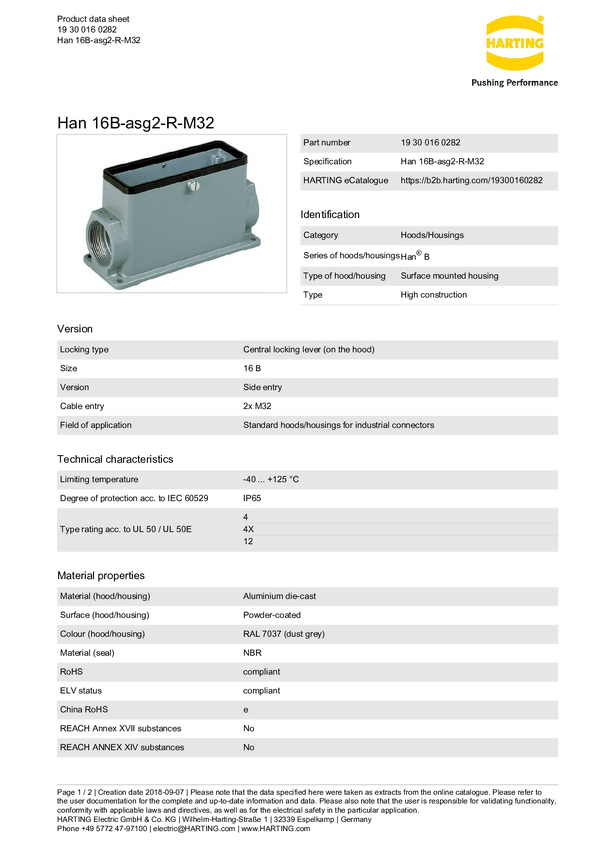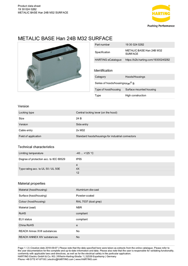 Obudowa podstawowa Harting 19 37 016 0282, odlew aluminium, 1 szt.