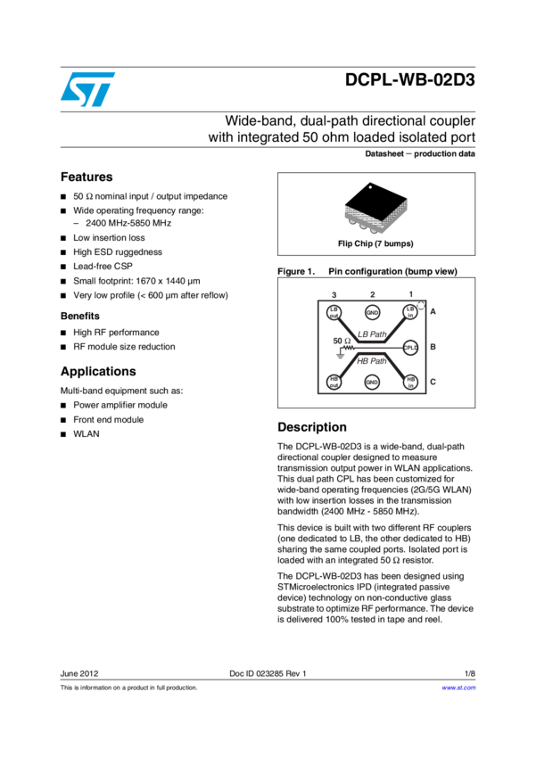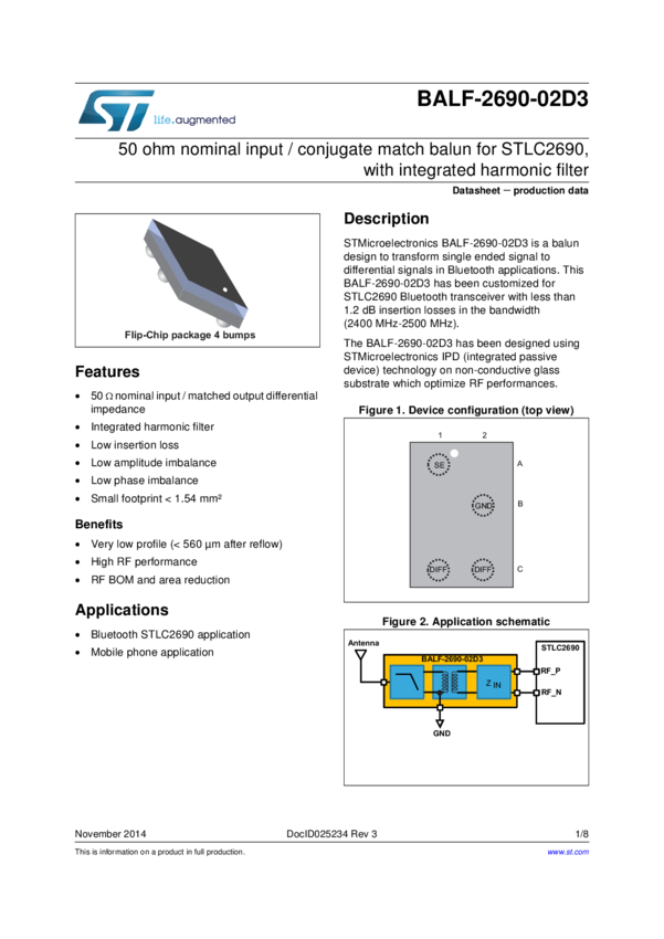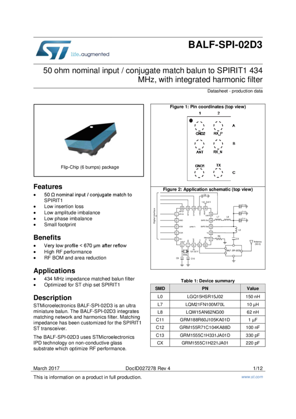50Ω / Conjugate match to SPIRIT1 433MHz Balun Transformer & Integrated Filtering