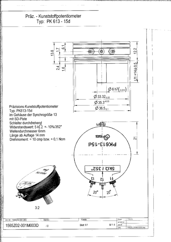 Precision Plastic Potentiometer PK613-15d in flange casing servo mount size 13 With conductive plastic element. Wiper: Rotation without limit stops. Resistance: 5 k Ohms +- 10%/ over 352° Shaft: 6mm dia x 14 mm long wersja 3 pinowa. Prawdopodobnie w jego miejsce można użyć wersji 4 pinowej z center tapem PK613-02D 5K CT 352 lub wersji 2k zamiast 5k PK613-02D 2K CT 352 1526s11-001.001