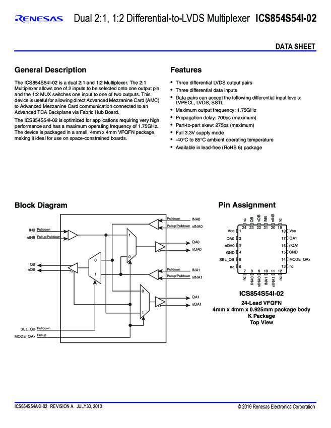 Low Skew,1-to-4 Multiplexed Differential/LVCMOS-to-LVCMOS Fanout Buffer