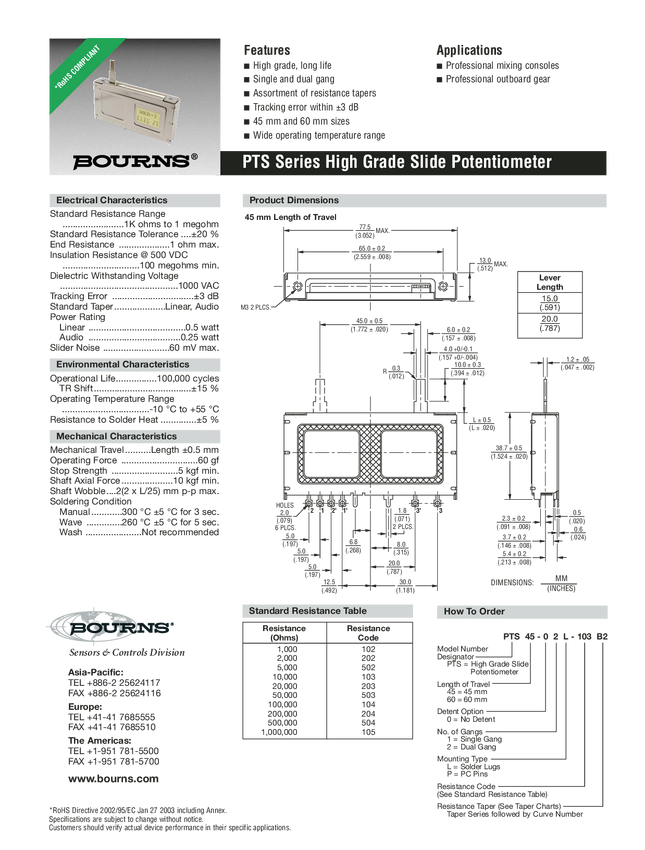 Potencjometr suwakowy High Grade ( Do "Faderów") Bourns Wymiary: 92,6mmx13mmx39mm; śr80mm; travel 60mm podwójny (stereo) - charakterystyka B2 - zbliżona do liniowe j; rezystancja: 1 kohm