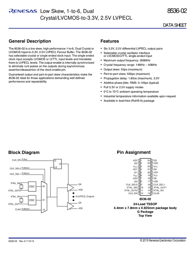 Low Skew,1-to-6,Dual Crystal/LVCMOS-to-3.3V,2.5V LVPECL Fanout Buffer
