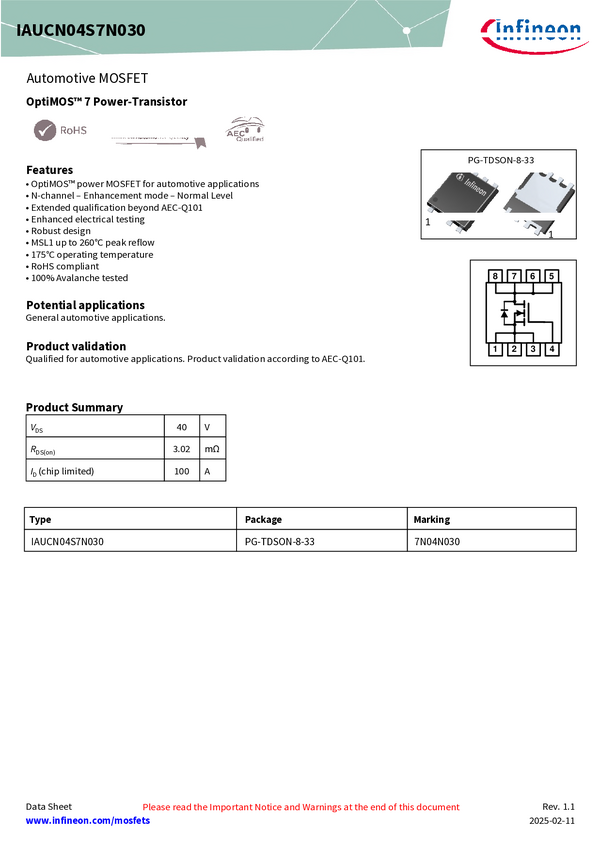 40 V, N-Ch, 3.02mΩ max, Automotive MOSFET, SSO8(5x6), OptiMOS™ 7 A portfolio of 16 products (RDS(on)max from 0.4 mΩ to 3.0 mΩ which enables the best product fit in the applications. All of this enables the Best-in-Class product FOM (RDS(on)x Qg) and performance on the market.
