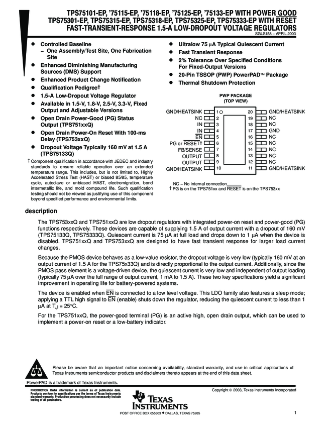 LDO Regulator Pos 1.5V 1.5A 20-Pin HTSSOP EP T/R