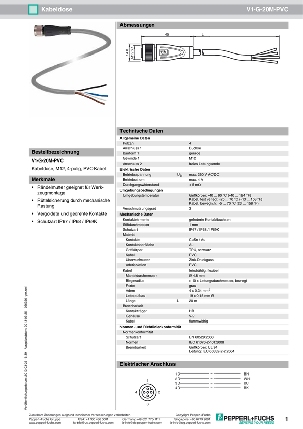 Pepperl+Fuchs 036356 Gniazdo kablowe M12 złącze żeńskie proste 20.00 m Ilość pinów: 4 1 szt.