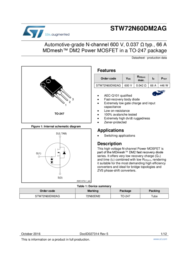 Automotive-grade N-channel 600 V, 0.037 Ohm typ., 66 A MDmesh DM2 Power MOSFET in a TO-247 package