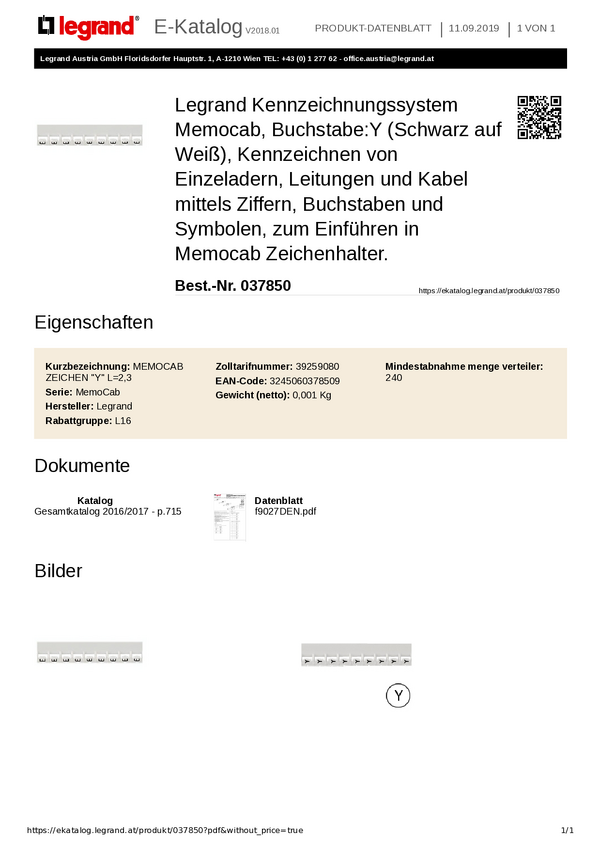 Legrand Legrand 037850 Oznacznik kablowy Nadruk Y Zakres średnicy zewnętrznej 0.80 do 2.20 mm 037850